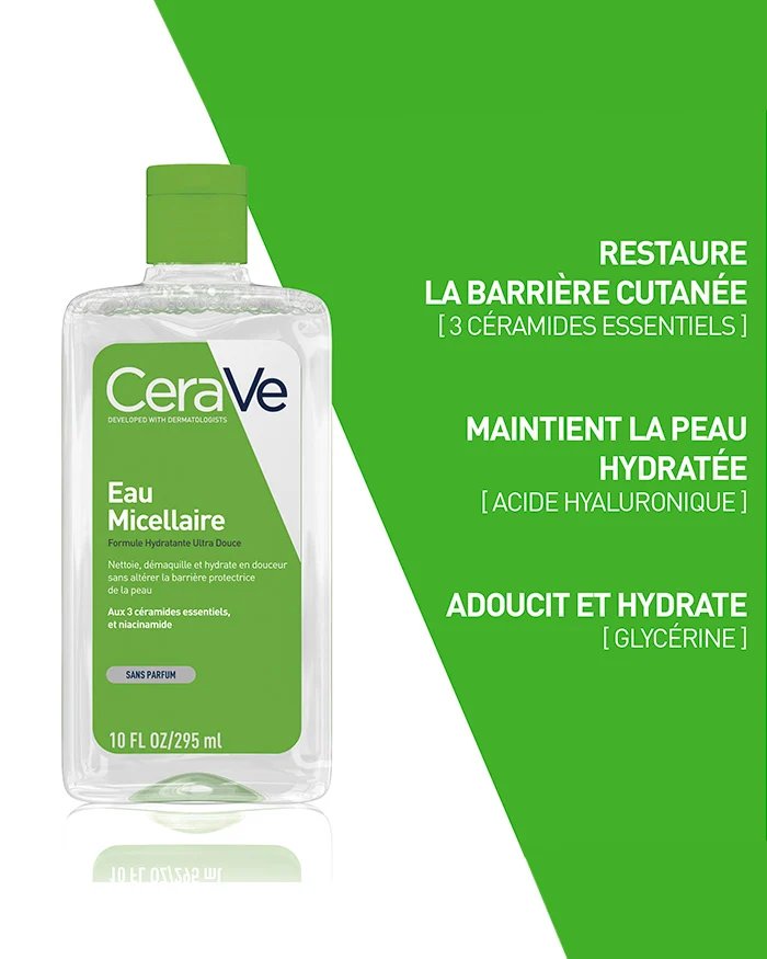 L’Eau Micellaire de CeraVe est un produit 3-en-1 qui nettoie, démaquille et hydrate les peaux normales à sèches, sans altérer la barrière cutanée. Elle nettoie la peau en douceur et élimine les impuretés, la pollution et le maquillage du visage, des yeux et du cou.
